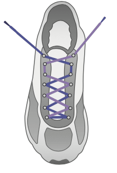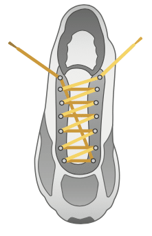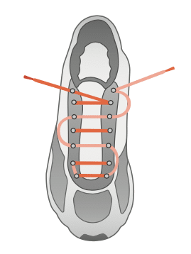 Ensarta la agujeta desde la punta del zapato en el patrón de cruz tradicional y detente en el penúltimo orificio. Ensarta cada extremo lateral de la agujeta en línea recta en el último orificio. Al hacerlo, se formarán dos pequeños agujeros, uno en cada lado. Pasa cada extremo de la agujeta por el agujero del lado contrario (forma de cruz) para “encerrar” el pie.