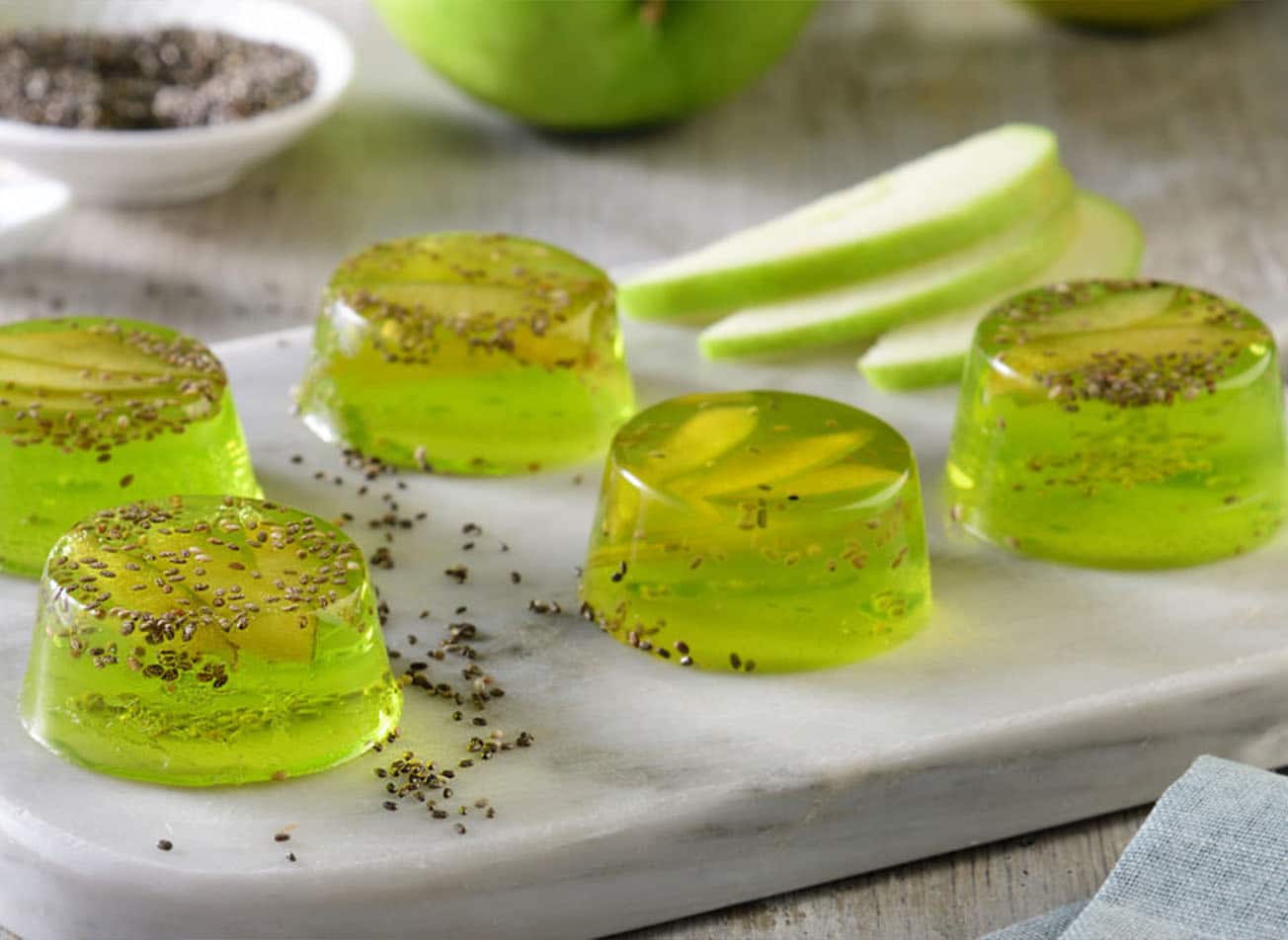 - Coloca las láminas de manzana y presiona ligeramente. Agrega un poco de chía y rellena con el resto de la gelatina.