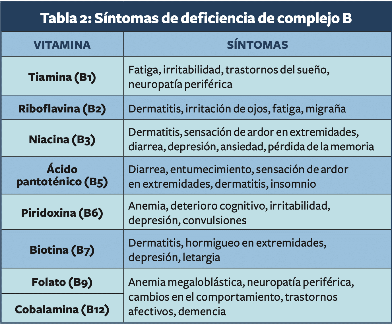 Alrededor del mundo, la deficiencia de complejo B es muy frecuente; en México, 68 % de las mujeres tienen baja ingesta de folatos (B9). Aunque pueden deberse a muchas causas (Tabla 1), las deficiencias de complejo B afectan la calidad de vida de las personas ya que, además de los datos clínicos que se presentan (Tabla 2), los niveles bajos de estas vitaminas se asocian a un peor estado de salud a lo largo de la vida.